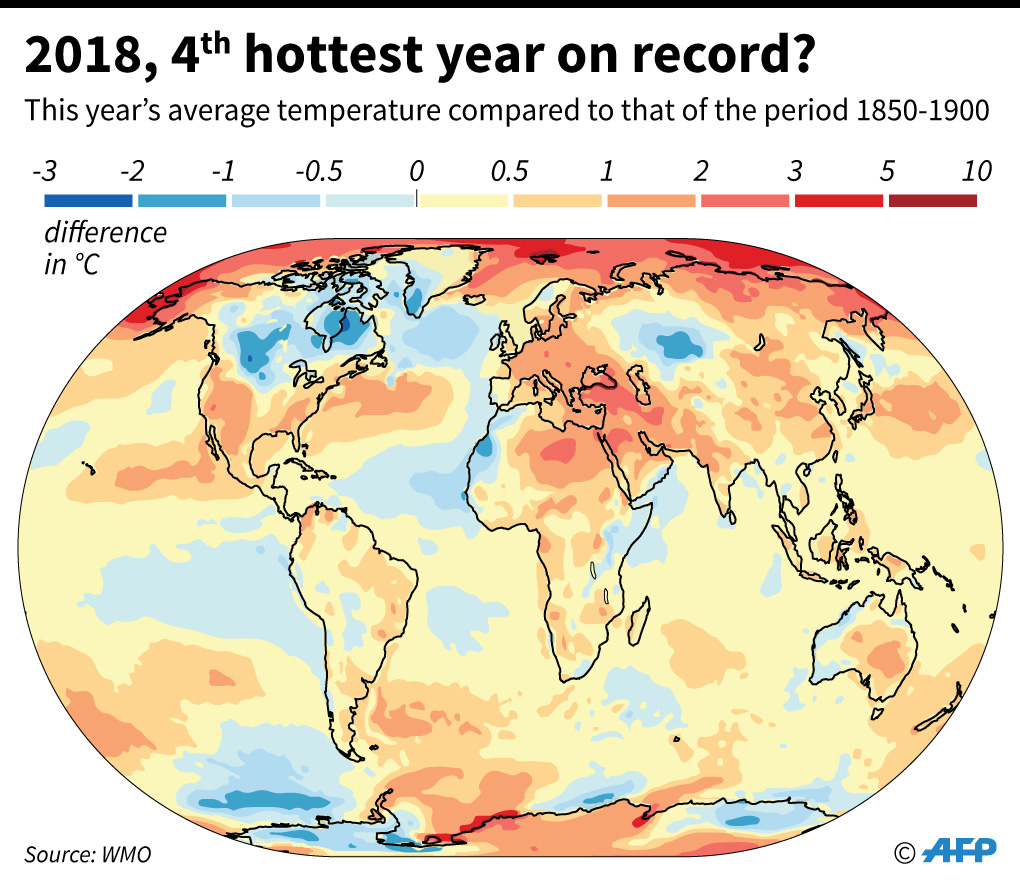 GENEVA, Switzerland (AFP) — Global temperatures in 2018 are set to be the fourth highest on record, the UN said Thursday, stressing the urgent need for action to rein in runaway warming of the planet.