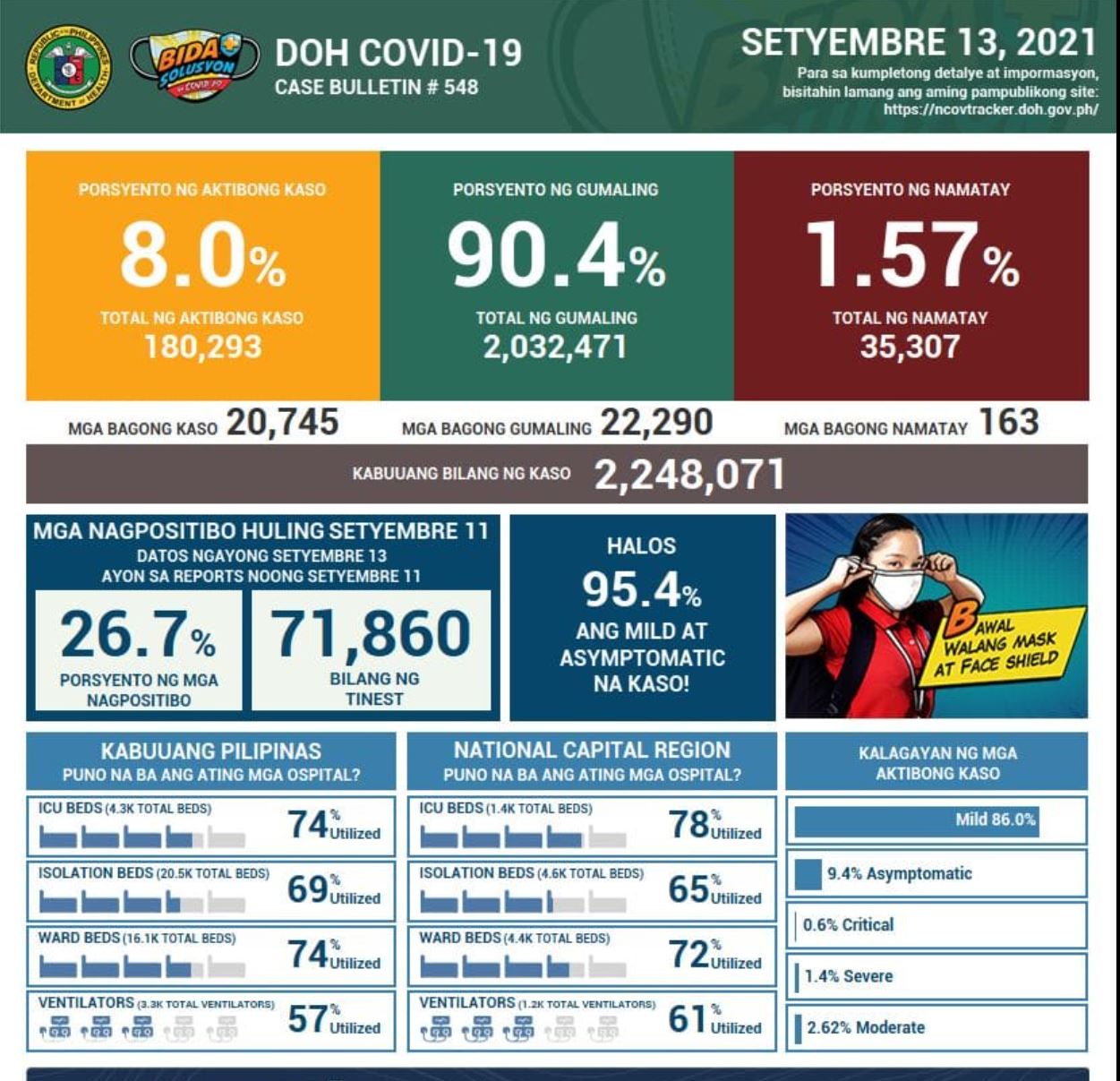 (Eagle News) – Another 20,745 new COVID-19 cases were added to the Philippines’ tally on Monday, Sept. 13, bringing the total active cases to 180,293, the Department of Health’s latest data showed.