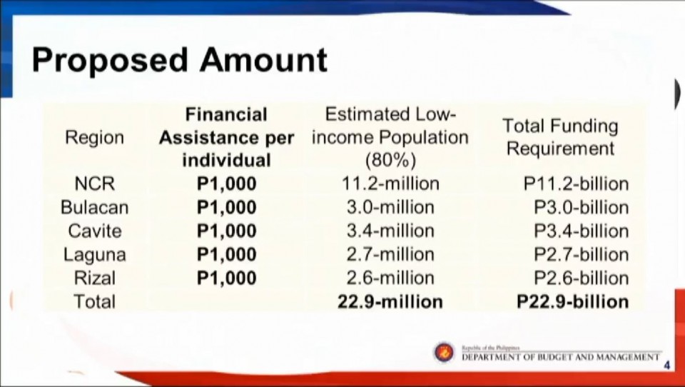 For NCR, there will be 11.2 million to receive this aid which will have a funding of P11.2 billion. In Bulacan, three million individuals would be given assistance of P1,000 each in kind, with a funding amount of P3 billion. In Cavite, there will be 3.4 million individuals that are allocated funds totaling P3.4 billion. In Laguna, 2.7 million individuals would be given assistance worth a total of P2.6 billion. In all, the total funds would be P22.9 billion.