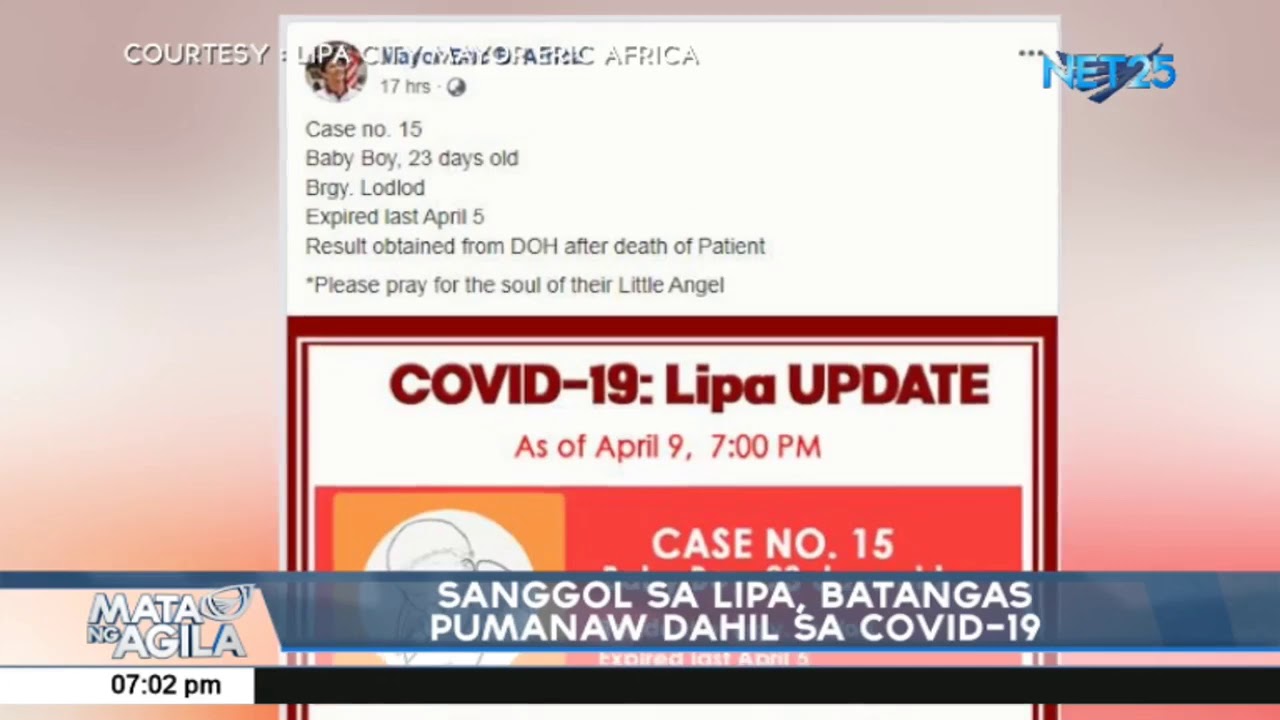 Lipa City mayor Eric Africa said in a Facebook post on April. 9 that the 23-day old baby boy was from Bgy. Lodlod in Lipa City, and is the 15th COVID-19 case in the city.