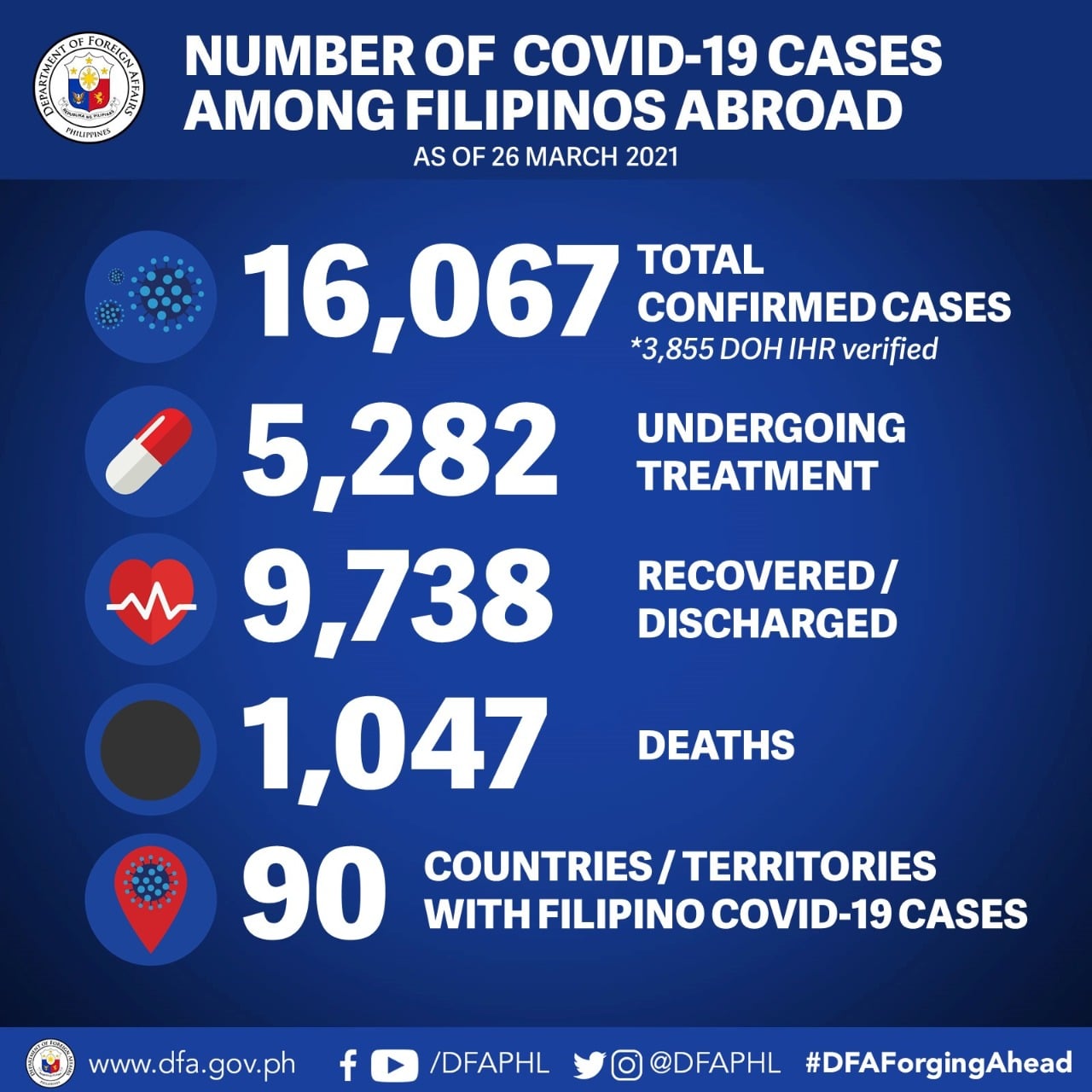 No additional fatality was reported, which means the COVID-19 death toll among Filipinos abroad remains at 1,047.