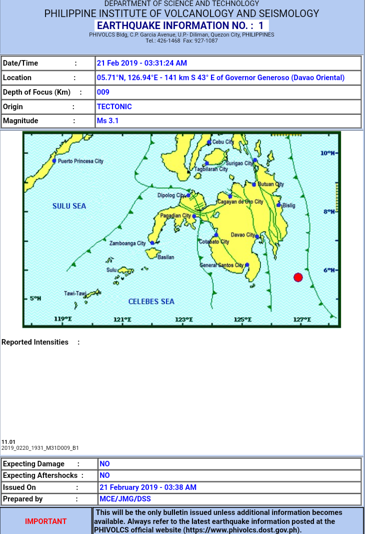 (Eagle News)—A 3.1-magnitude earthquake struck Davao Oriental on Thursday, Feb. 21.