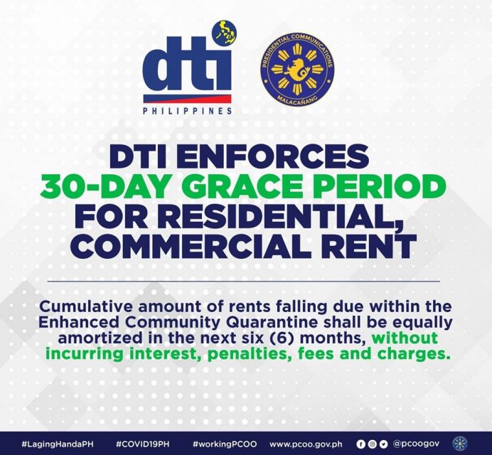 (Eagle News) – The Department of Trade and Industry (DTI) has issued a memorandum circular granting a 30-day grace period for residential and commercial rent during the enhanced community quarantine (ECQ).