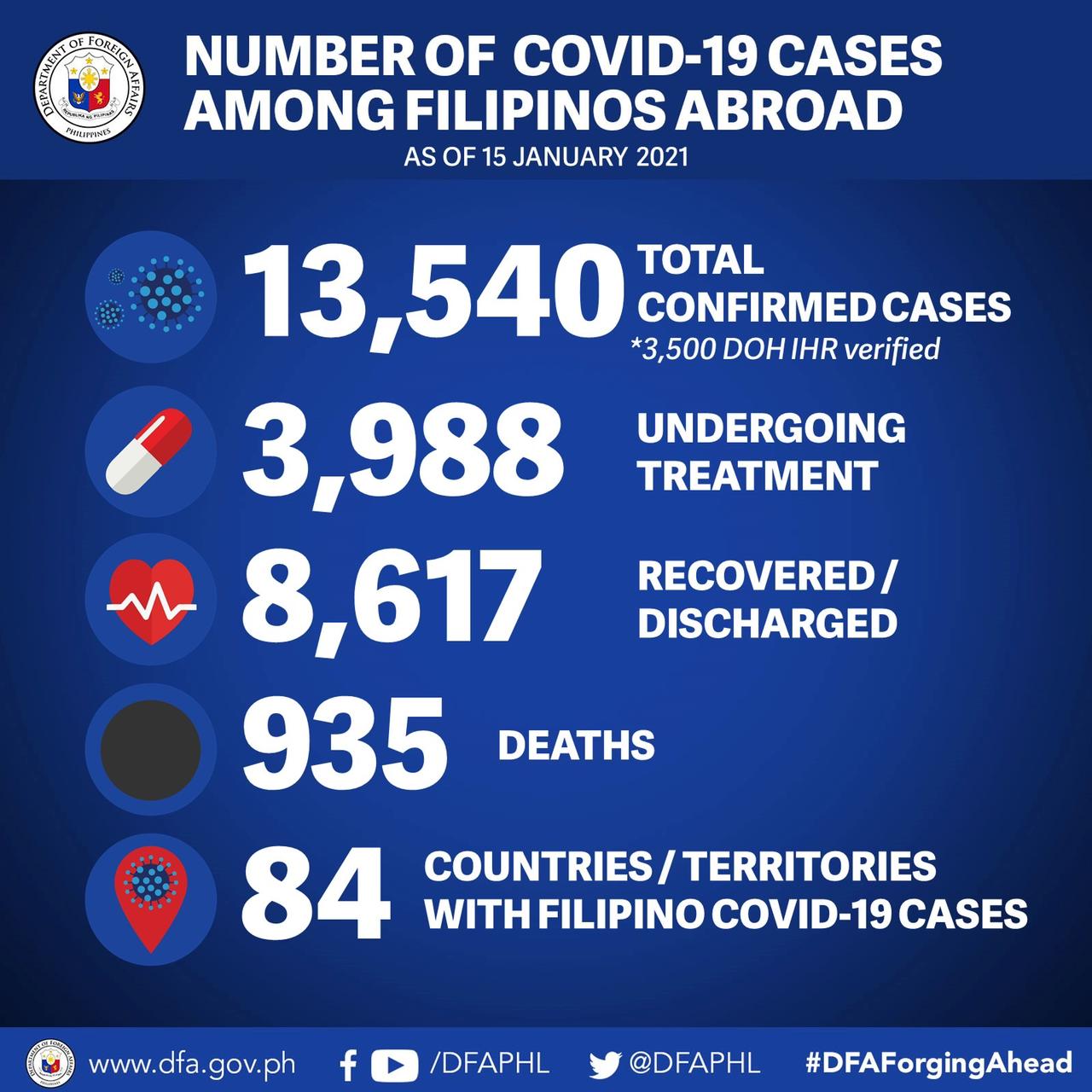 “The DFA personnel in our Foreign Service Posts remain steadfast in partnering with local health authorities and agencies to ensure Filipinos’ awareness of and adherence to preventive measures against the COVID-19 pandemic, and commit to tirelessly attending to the needs of our people, whenever possible,” the DFA said.