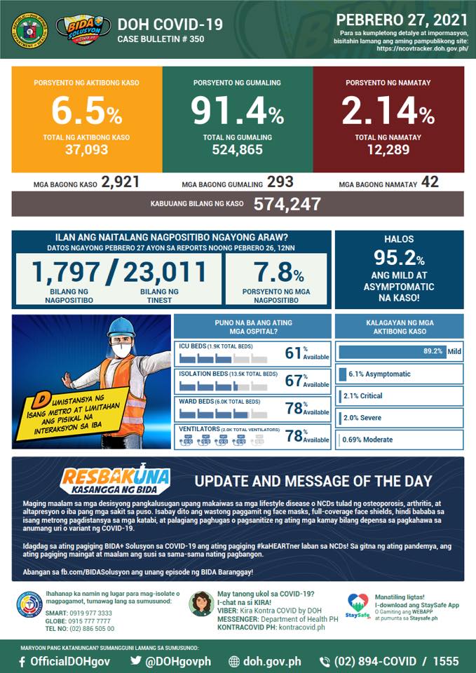 (Eagle News) — COVID-19 cases in the Philippines reached 574,247 after the Department of Health reported 2,921 additional cases on Saturday, Feb. 28.