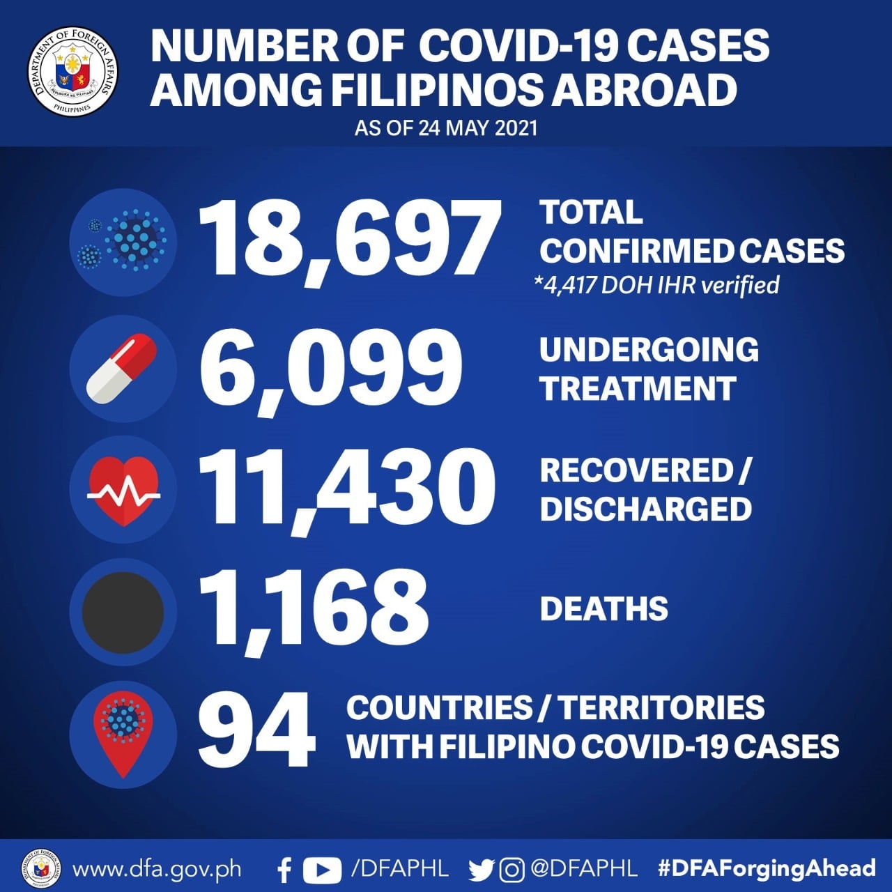 The Department of Foreign Affairs said the additional cases pushed the COVID-19 cases among Filipinos abroad to 18697.