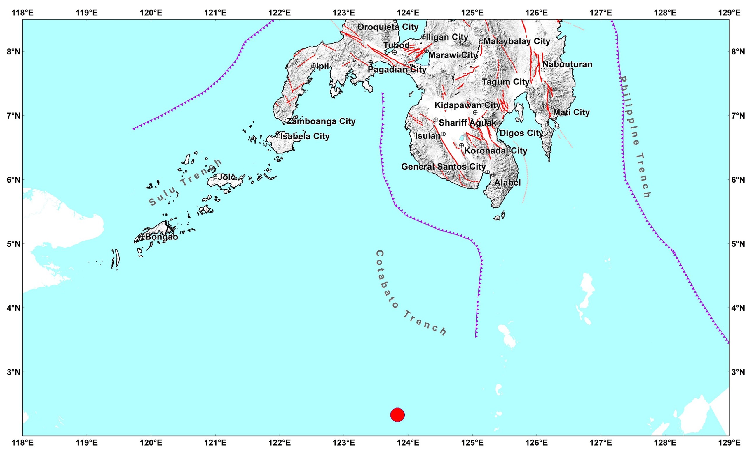 The epicenter was 385 kilometers southwest of Balut Island.