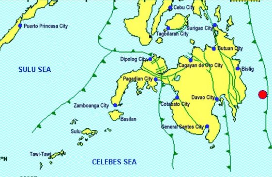 The Philippine Institute of Volcanology and Seismology said the quake hit 65 kilometers southeast of Caraga at 1:07 p.m.
