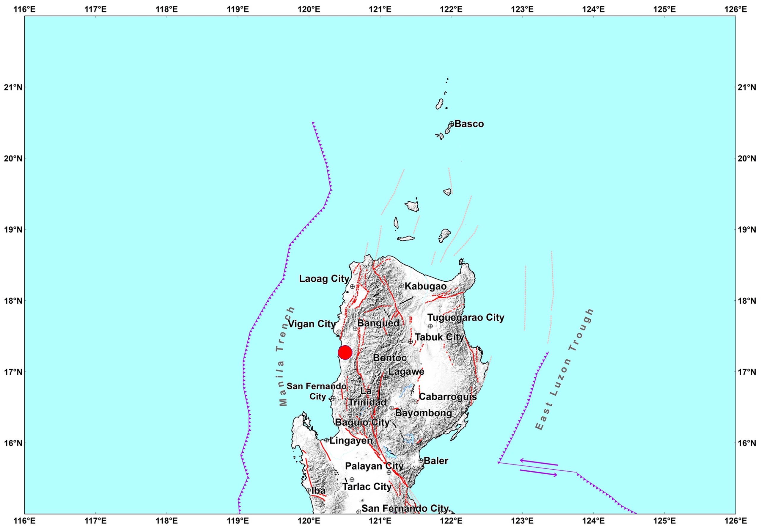 Intensity IV – Alilem, Cervantes, Gregorio Del Pilar, Galimuyod, Lidlidda, Banayoyo, Bantay, Caoayan, Quirino, Salcedo, San Emilio, Sigay, Nagbukel, and Suyo, Ilocos Sur; Lacub, Luba, Bucay, and Licuan-Baay, Abra