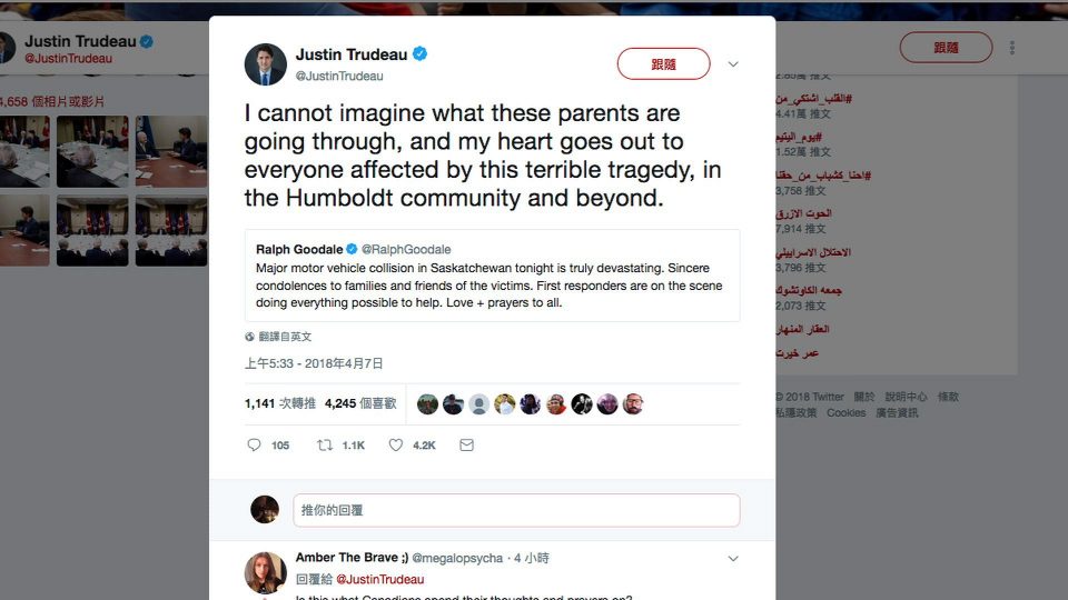 “I cannot imagine what these parents are going through, and my heart goes out to everyone affected by this terrible tragedy, in the Humboldt community and beyond,” Prime Minister Justin Trudeau tweeted.