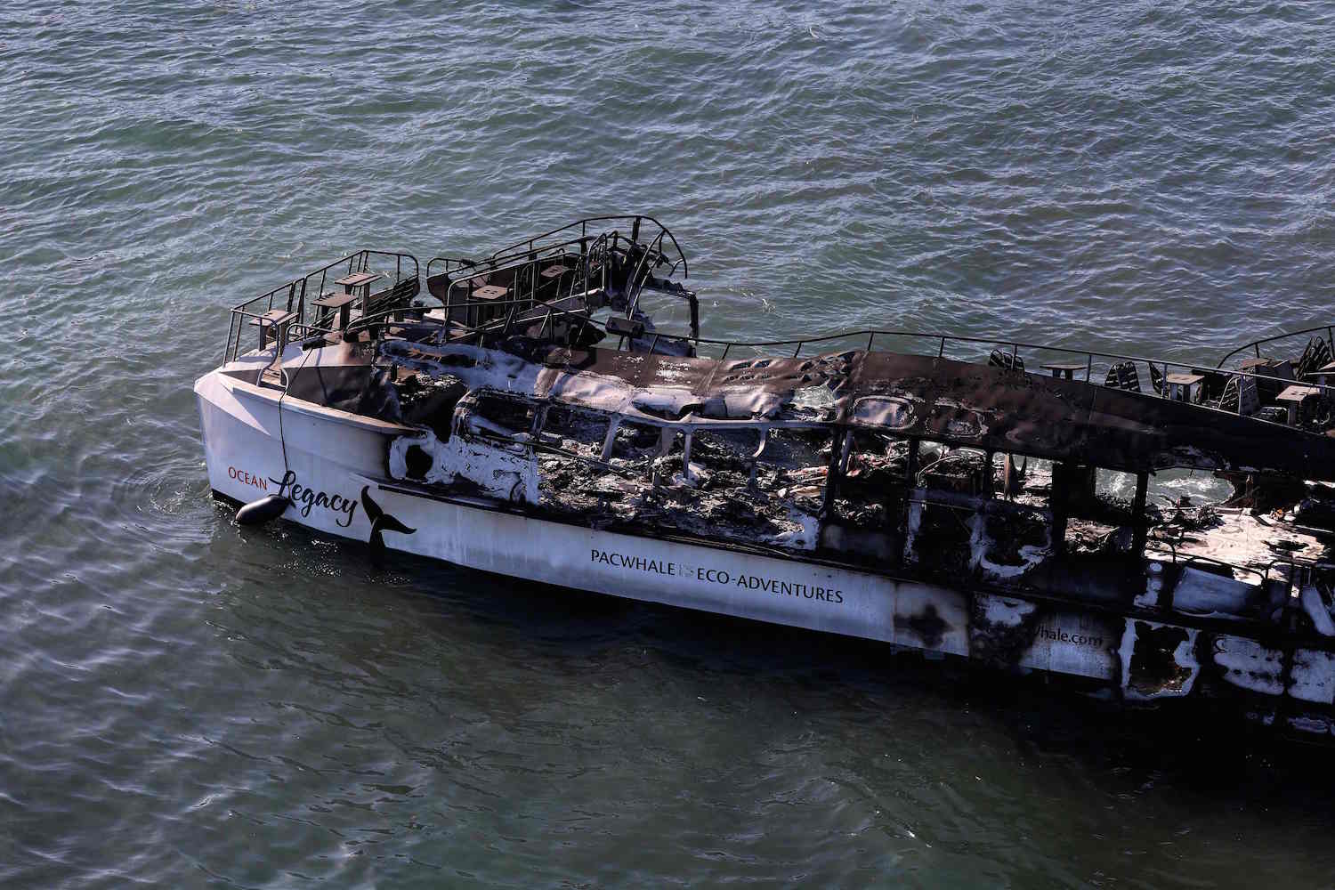 LAHAINA, HAWAII – AUGUST 11: In an aerial view, a boat destroyed by a wildfire sits in the water on August 11, 2023 in Lahaina, Hawaii. Dozens of people were killed and thousands were displaced after a wind-driven wildfire devastated the town of Lahaina on Tuesday. Crews are continuing to search for missing people. Justin Sullivan/Getty Images/AFP (Photo by JUSTIN SULLIVAN / GETTY IMAGES NORTH AMERICA / Getty Images via AFP)