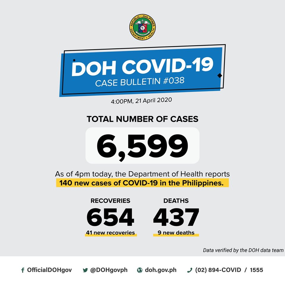 (Eagle News) — The Department of Health on Tuesday, April 21, reported 140 additional COVID-19 cases in the country, with recoveries still keeping their lead over deaths.