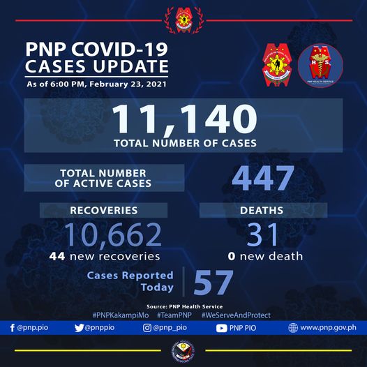 Fifty-seven additional cases, however, also pushed the PNP COVID-19 cases to 11140.