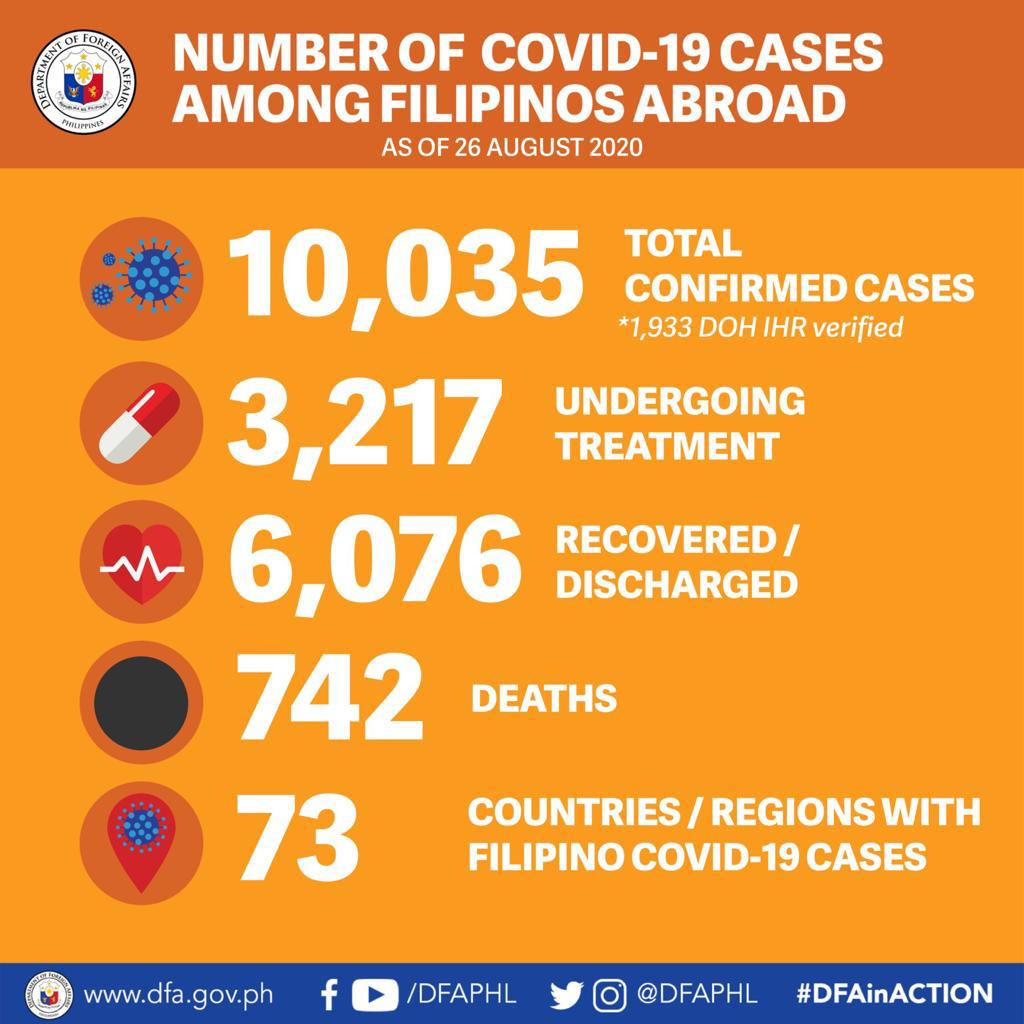COVID-19 cases among overseas Filipinos have reached 10,035 as of Aug. 26, the DFA said, with the additional seven cases from the Middle East.