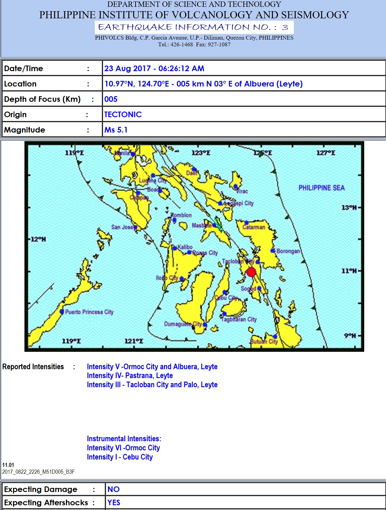 The strong shallow quake occurred at 6:26 a.m. on Wednesday, August 23, and was felt at intensity 5 in Ormoc City and in Albuera. Leyte; at intensity 4 in Pastrana, Leyte; and at intensity 3 in Tacloban City and Palo, Leyte.
