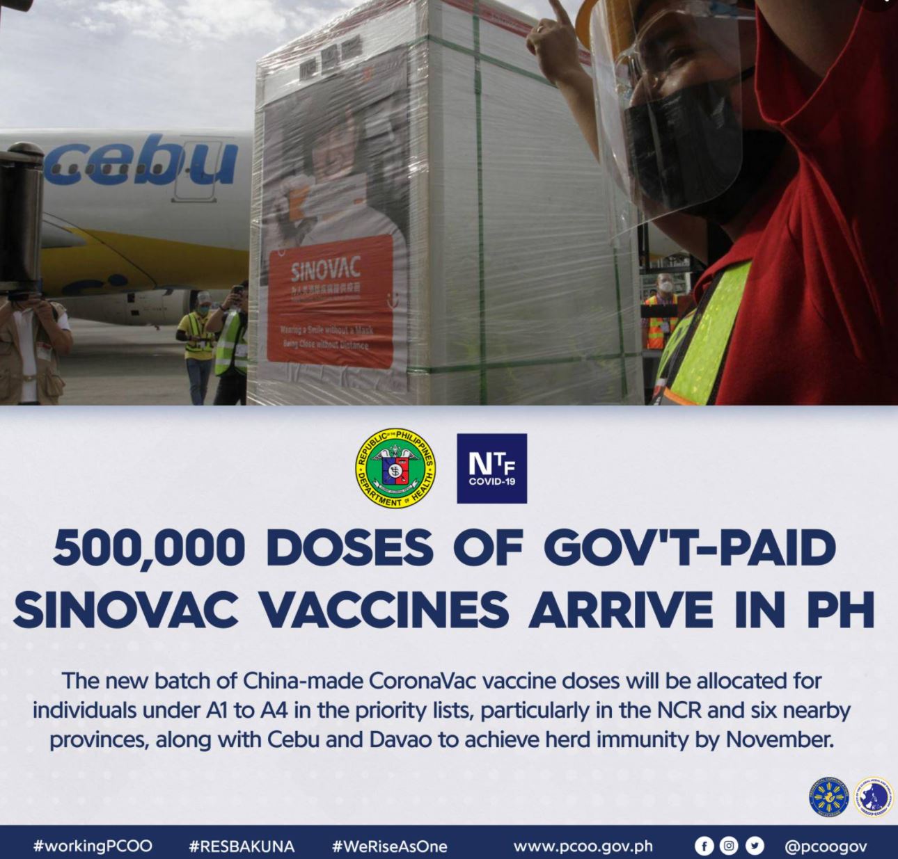 (Eagle News) – An additional 500,000 doses of Sinovac vaccines under the brand name CoronaVac arrived in the country on Thursday morning, May 20. This brought the total Sinovac vaccine doses delivered so far at 5.5 million, and over-all total of COVID vaccine doses of 8.2 million.