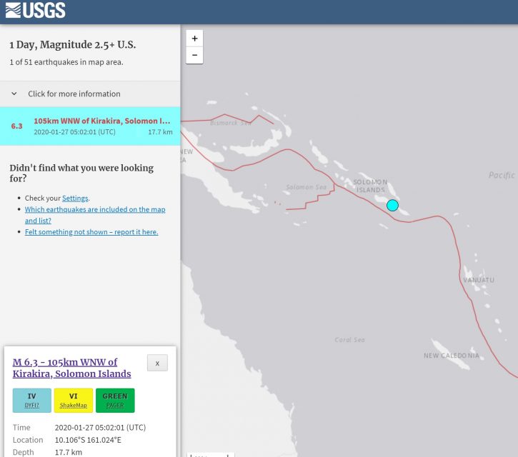 (Eagle News) — A magnitude 6.3 earthquake rocked the Solomon Islands on Monday, Jan. 27, about 105 kilometers west northwest of Kirakira, according to the US Geological Survey.