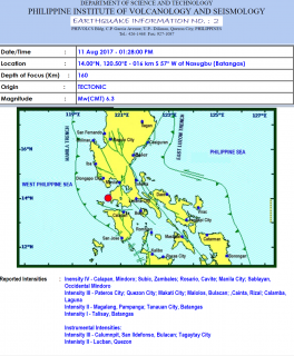 The quake’s epicenter was located at 16 kilometers southwest of Nasugbu, Batangas and had a depth of 160 kilometers, according to PHIVOLCS.