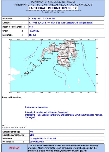 (Eagle News)–A 6.4-magnitude earthquake struck Maguindanao early Sunday, Aug. 2.
