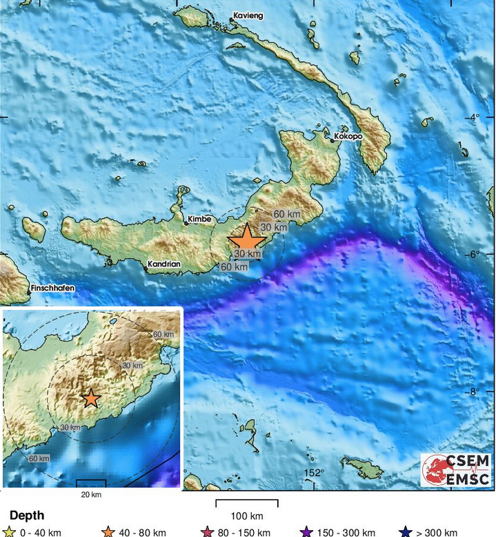 The epicentre of the quake, which hit at 0656 local time (2056 GMT), was roughly 110 kilometres (68 miles) east-southeast of Kimbe on the island of New Britain, at a depth of 64 kilometres, the US Geological Survey said.