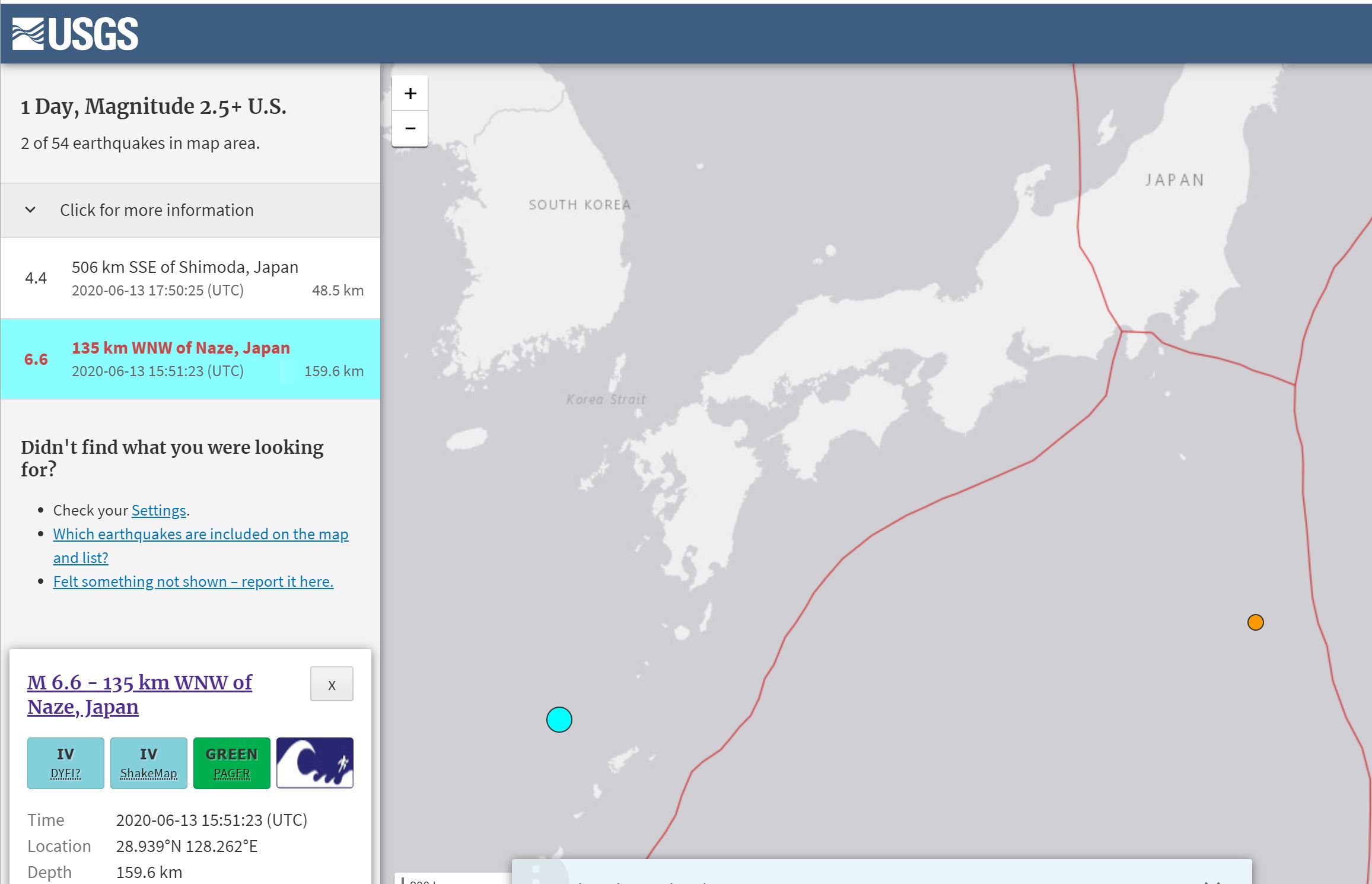 There were no immediate reports of injury or damage caused by the earthquake; its epicentre was 135 kilometres (84 miles) northwest of Naze, Japan.