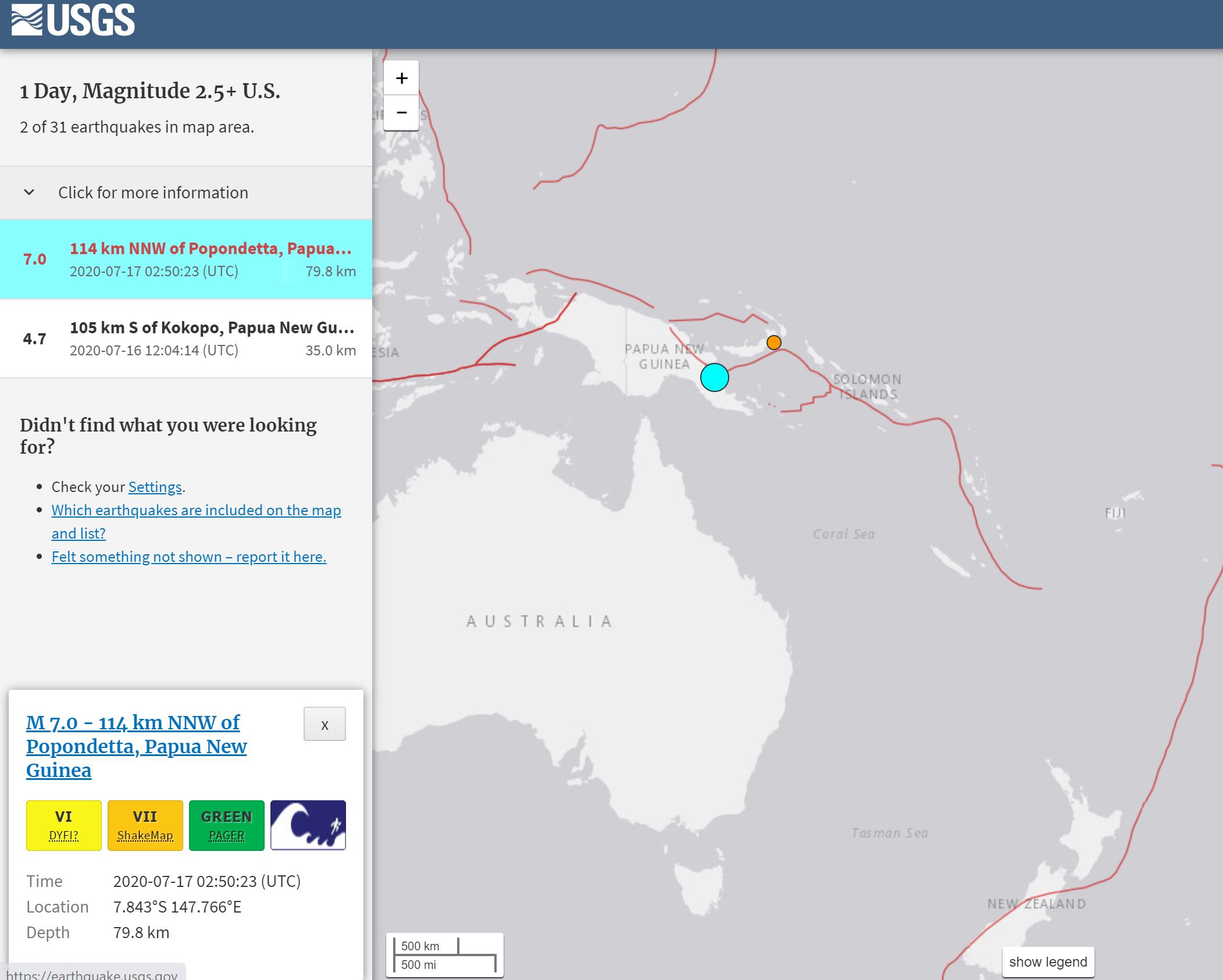 The quake was 79.8 kilometers deep and its epicenter was located 114 kilometers north northwest of Popondetta, Papua New Guinea, the US Geological Survey said.