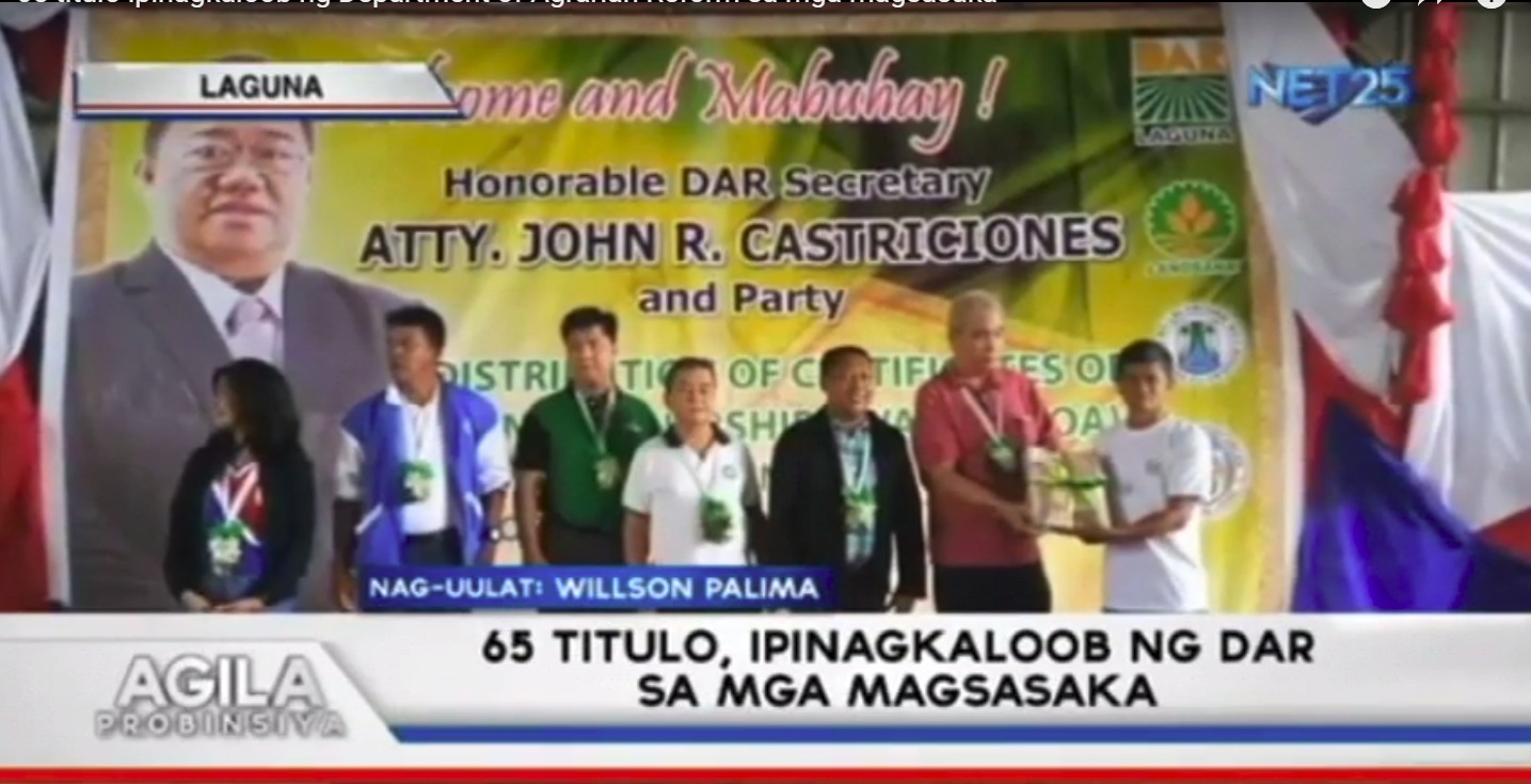 NAGCARLAN, Laguna (Eagle News) – Matapos ang mahigit na 30 taon paghihintay kaugnay ng patuloy na ipinaglalaban ng mga magsasaka sa Laguna ay ipinagkaloob ng pamunuan ng Department of Agrarian Reform (DAR) ang may 65 titulo, certificate of land ownership award (CLOA) sa lahat ng mga agrarian reform beneficiaries (ARB) sa Nagcarlan, Laguna kamakailan.
