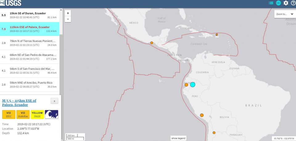 (Eagle News) — A magnitude 7.5 rocked Ecuador, 115 kilometers east southeast of the town of Palora in the Morona Santiago province on Friday, just before dawn, at 4:17 a.m. (6:17 p.m. Philippine time, 10:17 UTC or Coordinated Universal Time)