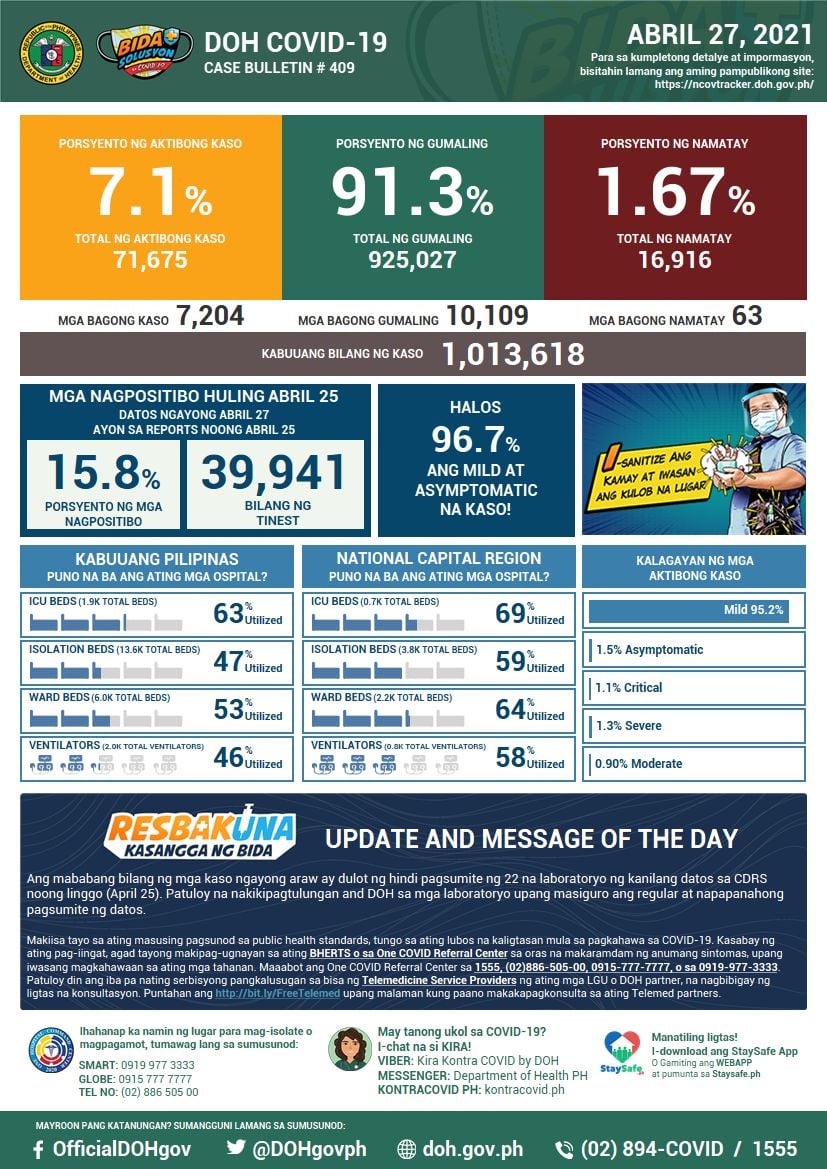 (Eagle News) — COVID-19 cases in the Philippines reached 1,013,618 after the Department of Health reported 7204 additional cases.
