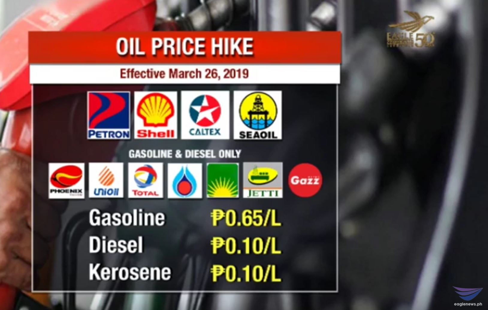 (Eagle News) — Expect another round of fuel price increase on Tuesday, March 26, starting 6 a.m., with gasoline up by 65 centavos per liter, while kerosene and diesel up by another 10 centavos per liter.