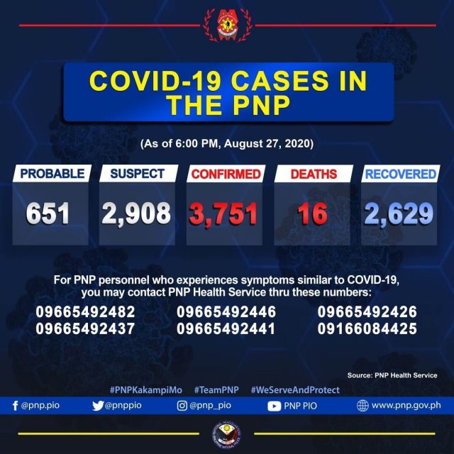 According to the PNP, as of Thursday night, COVID-19 cases within the organization rose to 3751, from the 3669 reported on Wednesday night.