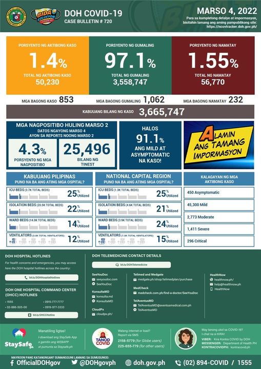 According to the DOH, of the 853 reported cases today, 784 (92%) occurred within the recent 14 days (February 19 – March 4, 2022).