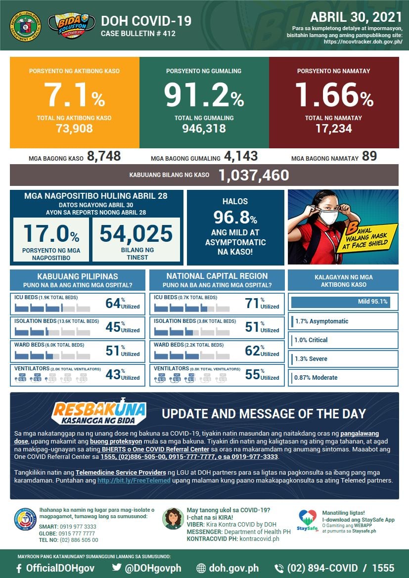 (Eagle News) — Philippine COVID-19 cases reached 1,037,460 after the Department of Health reported 8748 additional cases.