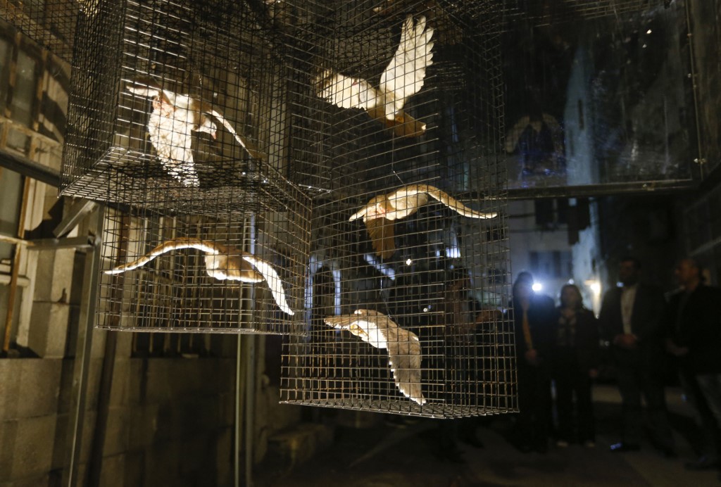Students Raneem al-Lahham and Hassan al-Maghout locked the birds inside cages in their installation.
