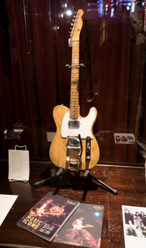 Other famous guitars went under the hammer on Saturday: George Harrison’s first electric guitar, a $40,000 Hofner Club 40, and a Fender Telecaster rosewood guitar made for Elvis Presley in 1968, priced at a cool $115,200.