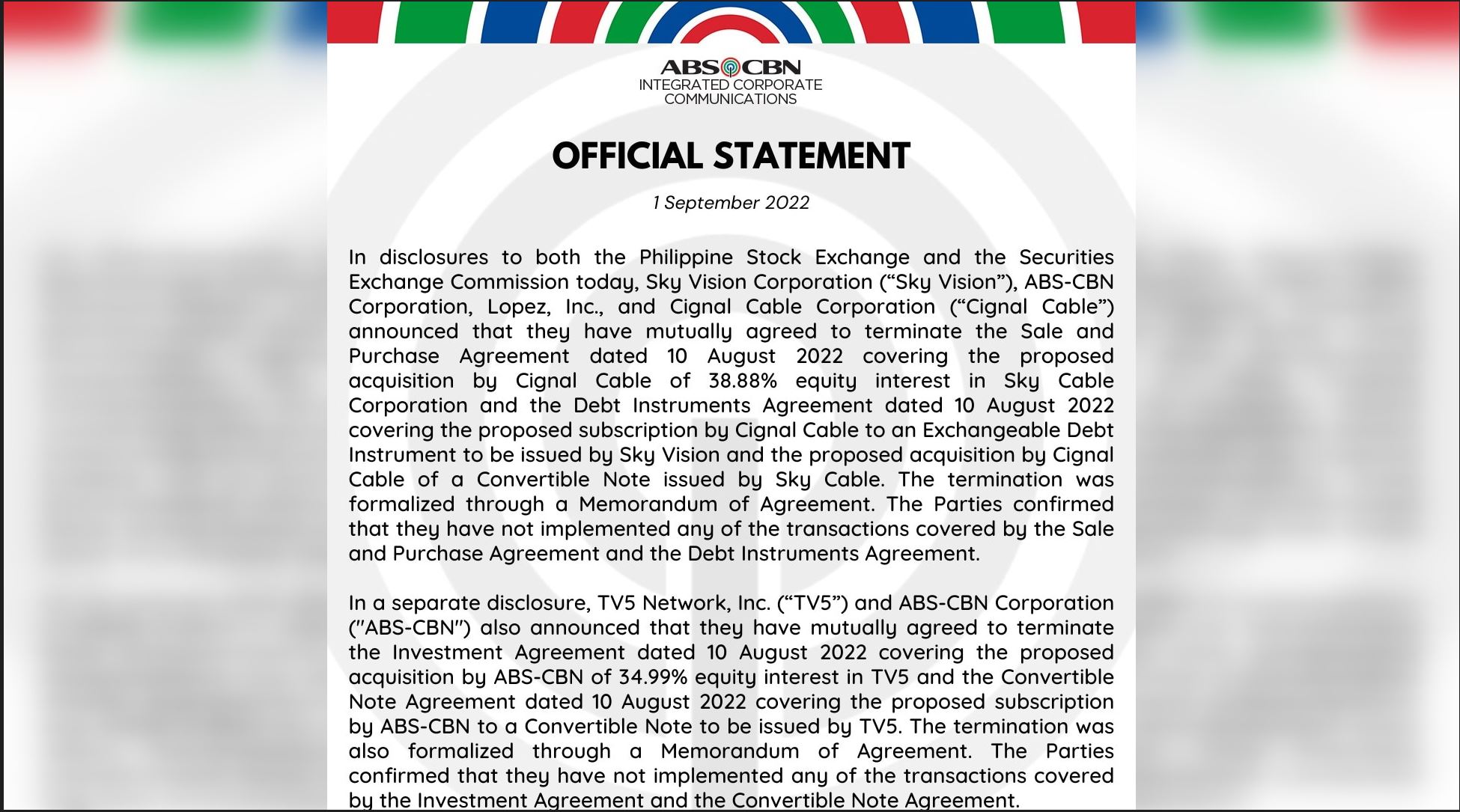 In another disclosure to both the PSE and the SEC also on Thursday, “Sky Vision Corporation (“Sky Vision”), ABS-CBN Corporation, Lopez, Inc., and Cignal Cable Corporation (“Cignal Cable”) announced that they have mutually agreed to terminate the Sale and Purchase Agreement” dated August 10, 2022 that covered the proposed acquisition by Cignal Cable of 38.88% equity interest in Sky Cable Corporation.
