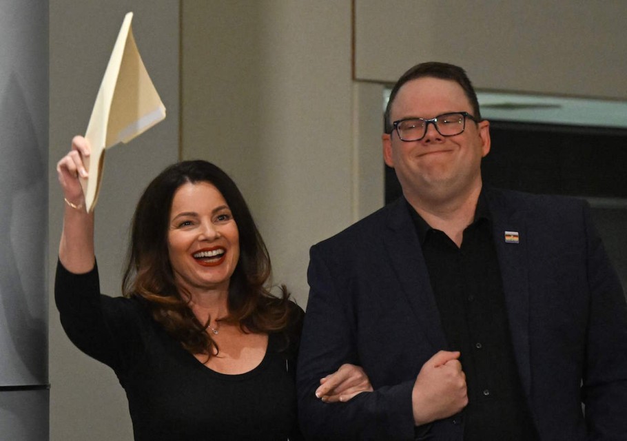 SAG-AFTRA President Fran Drescher (L) and Duncan Crabtree-Ireland, SAG-AFTRA’s executive director and chief negotiator, arrive for a press conference following the end of the Screen Actors Guild (SAG-AFTRA) strike in Los Angeles, California, on November 10, 2023. The Screen Actors Guild (SAG-AFTRA) reached a deal with studios like Disney and Netflix this week to end its nearly four-month strike. Its board members on November 10 voted 86 percent in favor of ratifying the agreement. (Photo by Robyn Beck / AFP)