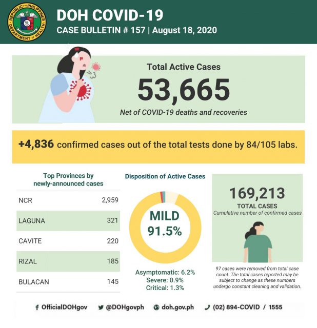 (Eagle News) — The number of coronavirus disease 2019 cases in the country rose to 169,213 on Tuesday, Aug. 18, after the Department of Health reported 4836 cases on the same day.
