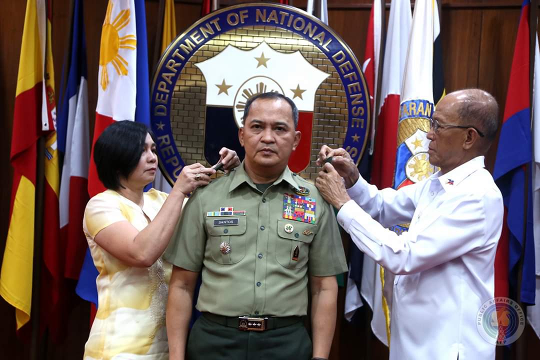 The AFP’s Public Affairs Office said in a Tweet Defense Secretary.Delfin Lorenzana administered the donning of the rank to Santos, who was a lieutenant general, in a ceremony held at the Department of National Defense.