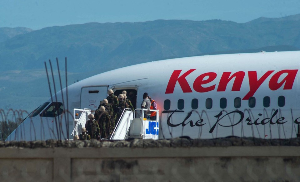 Wearing camouflage uniforms, helmets and rifles, about 200 officers descended from a Kenya Airways plane on the tarmac in the Haitian capital Port-au-Prince. More are expected Thursday.