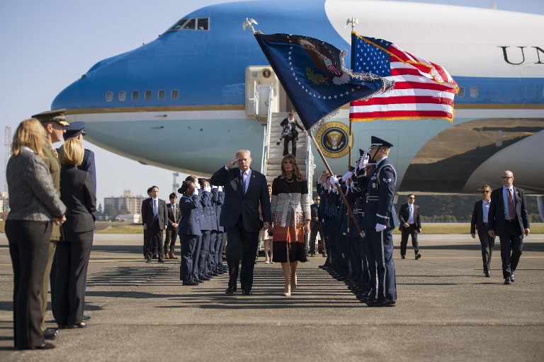 Trump touched down in Japan on November 5, kicking off the first leg of a high-stakes Asia tour set to be dominated by soaring tensions with nuclear-armed North Korea. / AFP PHOTO / JIM WATSON