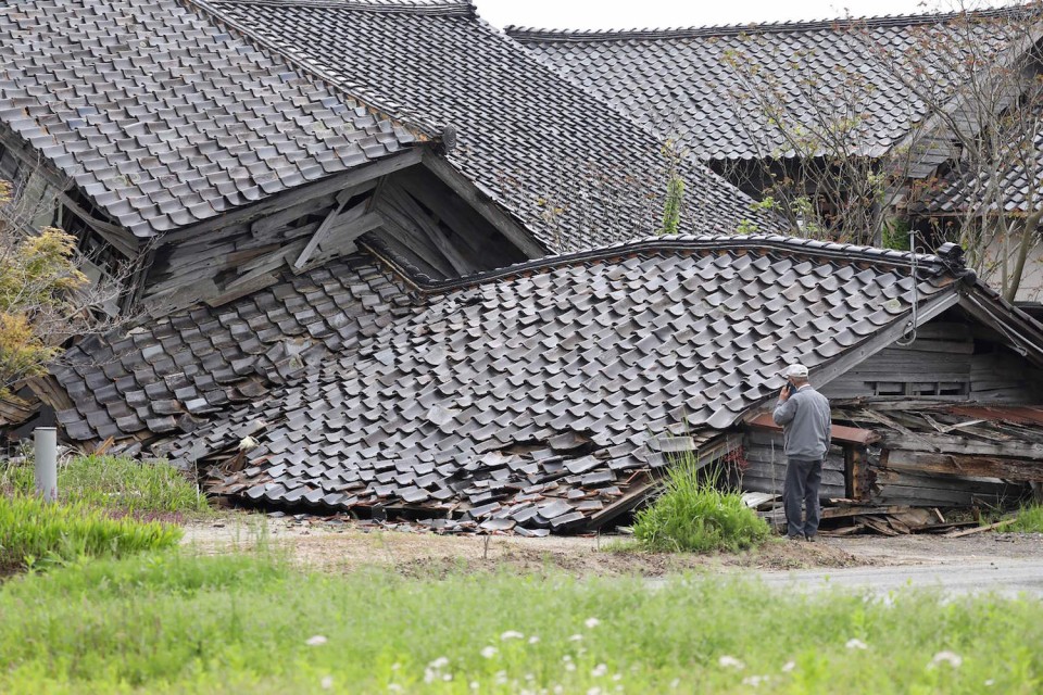 A man looks at a house which collapsed after a 6.5 magnitude earthquake hit the area the day before, in the city of Suzu, Ishikawa prefecture on May 6, 2023. – Aftershocks shook Japan a day after the powerful quake left at least one person dead, with officials assessing damage on May 6 from the jolt that destroyed several buildings. (Photo by JIJI Press / AFP)