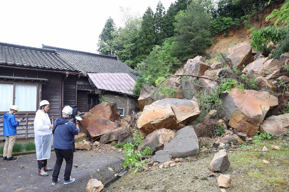 Large boulders sit at the back of a house where a woman was trapped after a landslide was triggered by a 6.5 magnitude earthquake in the area the day before, in the city of Suzu, Ishikawa prefecture on May 6, 2023. – Aftershocks shook Japan a day after the powerful quake left at least one person dead, with officials assessing damage on May 6 from the jolt that destroyed several buildings. (Photo by JIJI Press / AFP)
