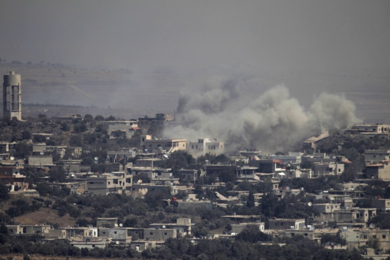 Israeli aircraft struck Syrian army positions on September 10 after fire from its war-torn neighbour, Syria, hit the Israeli-held zone of the Golan Heights earlier in the day, the Israeli military said, adding in an army statement that the strike targeted artillery positions of the Syrian regime in response to “a projectile” which hit the northern Golan, causing no injuries or damages. / AFP PHOTO / JALAA MAREY