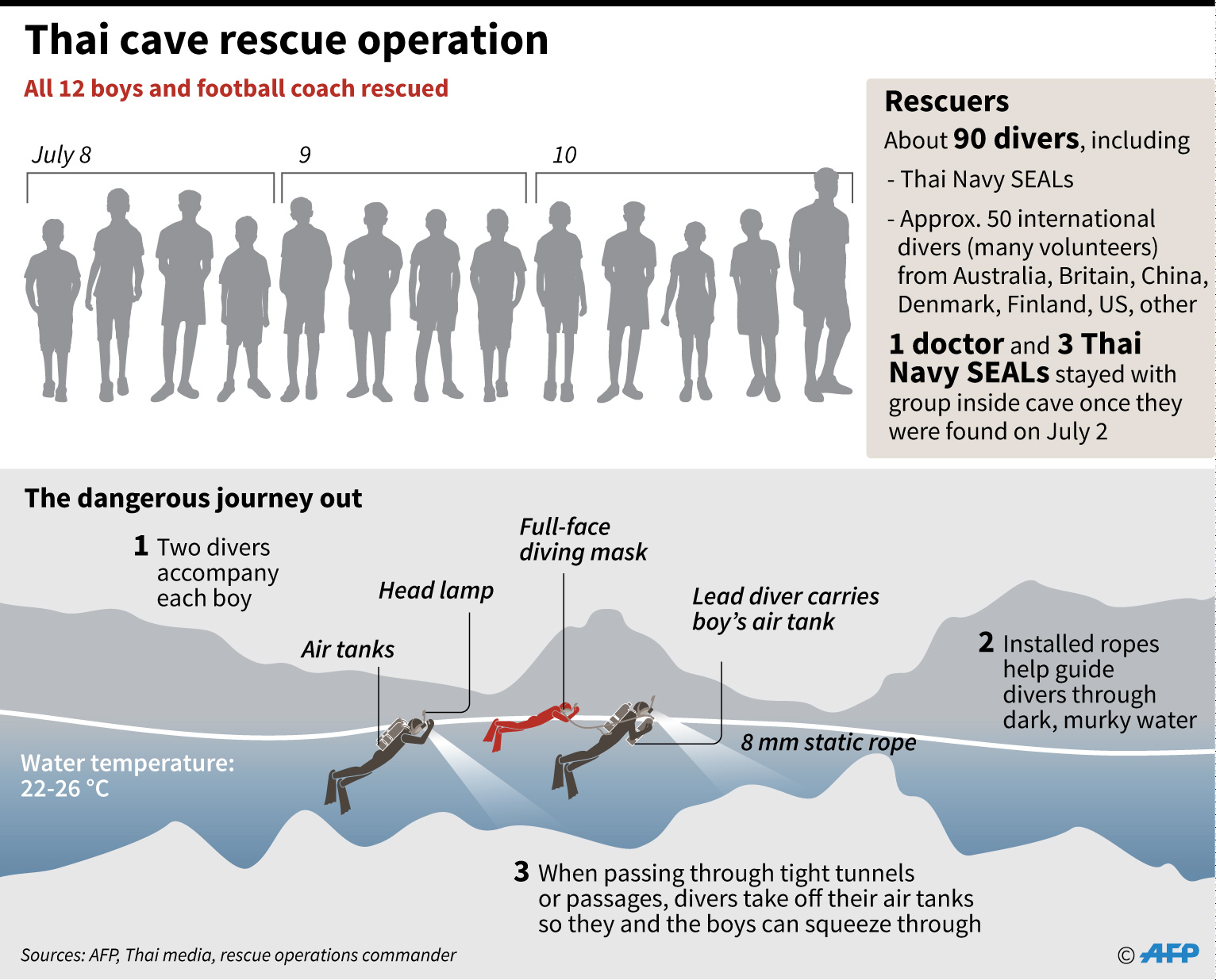 With oxygen levels in their chamber falling to dangerous levels and monsoon rains threatening to flood the cave above the ledge where the boys were sheltering, rescuers decided on the least-worst option of having divers escort them out through the tunnels.