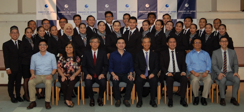 Embassy of Japan Head of Chancery Minister Hiroyuki Uchida, JICC Director Tatsuo Kitagawa, JICC Researcher/Adviser Simon Kubota, NYC Chief Operating Officer Mr. Nielex Tupas, National Leader Atty. Kahlil Lamigo, and representatives from the National Youth Commission together with the 43rd SSEAYP Philippine Delegation during Pre-Departure Orientation held at the JICC Hall.