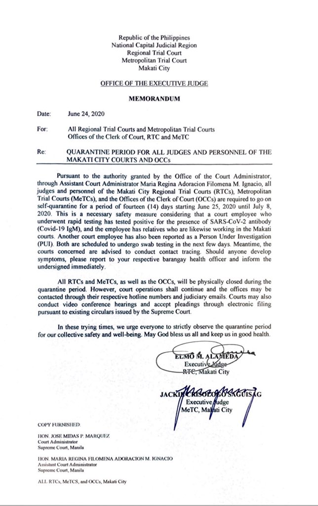 A memorandum from Regional Trial Court Executive Judge Elmo Alameda and Metropolitan Trial Court Jackie Crisologo Saguisag said the Offices of the Clerk of Courts will also be closed during the period when all judges and personnel will be in quarantine.