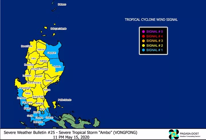 Signal No. 2 is hoisted over Babuyan Islands, the northwestern portion of mainland Cagayan (Santa Praxedes, Claveria, Sanchez Mira, Pamplona, Abulug), southern and western portion of Isabela (Quezon, Mallig, Roxas, Quirino, San Manuel, Burgos, Gamu, Reina Mercedes, Aurora, Luna Cabatuan, Naguilian, Benito Soliven, Cauayan, San Guillermo, Dinapigue, San Mateo, Alicia, Angadanan, Ramon, San Isidro, Echague, Jones, San Agustin, Santiago, Cordon), Ilocos Norte, Ilocos Sur, Apayao, Abra, Kalinga, Mountain Province, Ifugao, Benguet, La Union, Nueva Vizcaya, Nueva Ecija, Quirino, Aurora, Pangasinan, Tarlac, Pampanga, Bulacan, Metro Manila, Rizal, and the northern portion of Quezon (General Nakar, Infanta) including Polillo Islands.