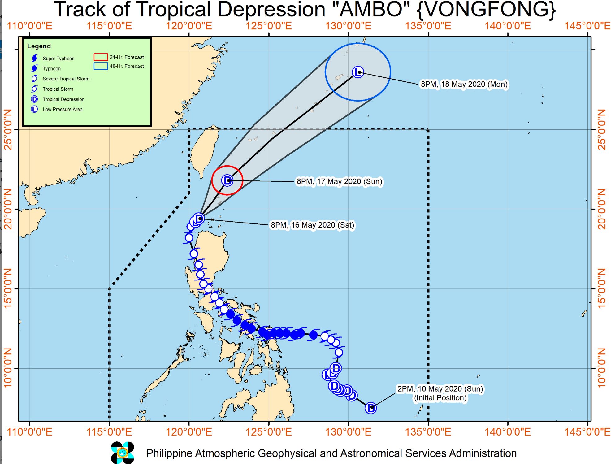 At 10 p.m. Saturday, May 16, the center of Tropical Depression “AMBO” was estimated based on all available data at 95 km West of Calayan, Cagayan (19.4 °N, 120.6 °E ).