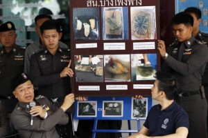 Policemen show pictures of body parts found in parcels as they address reporters in Bangkok November 17, 2014. REUTERS/Chaiwat Subprasom